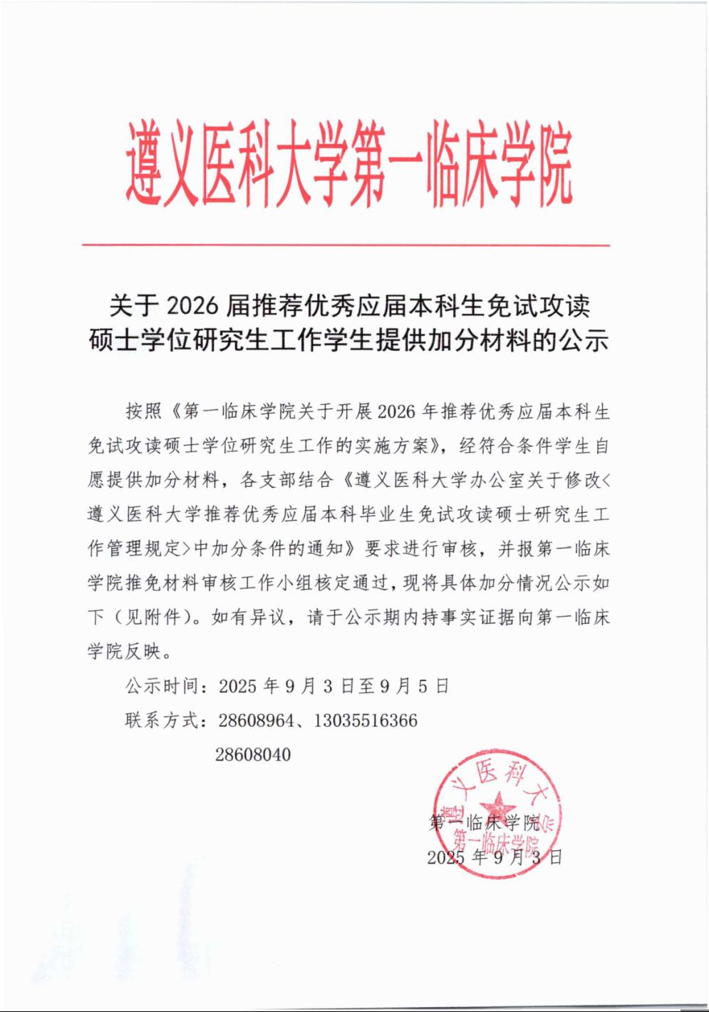 关于2026届推荐优秀应届本科生免试攻读硕士学位研究生工作员工提供加分材料的公示