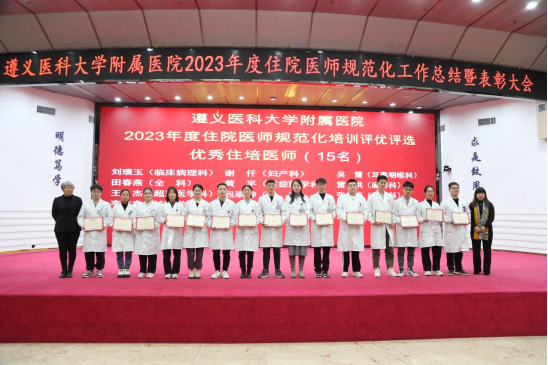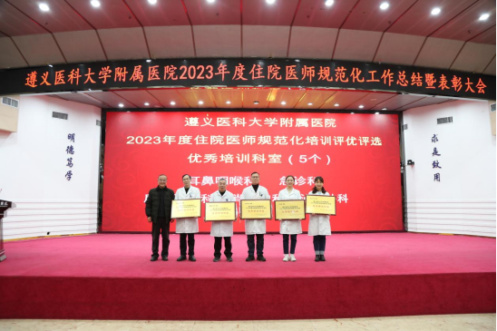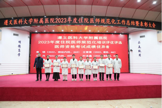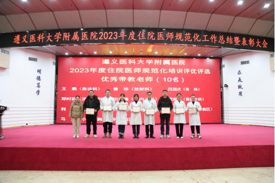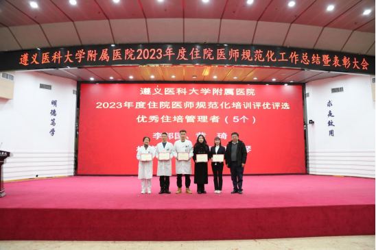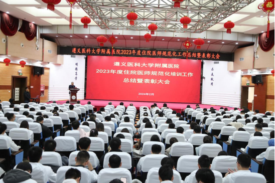 元春始风华,万象启新朝。2024年2月5日下午,遵医附院在第二住院楼四楼多功能厅召开了2023年度住院医师规范化培训工作总结表彰大会。会议总结回顾了2023年住培工作的优良成绩,表彰了住培优秀专业基地、优秀培训科室、优秀管理者、优秀带教老师、优秀住培医师,明确2024年的工作目标并作出安排部署。遵医附院经理、培训基地负责人余昌胤,遵医附公司党委副书记刘琪、太阳成集团tyc班子成员郑洪、王东红、杨洪艳、杨敏、金祝、肖雪、辛志军出席会议。各专业基地和培训科室代表、各年级住培医师代表参会。会议由太阳成集团tyc副经理杨敏主持。
