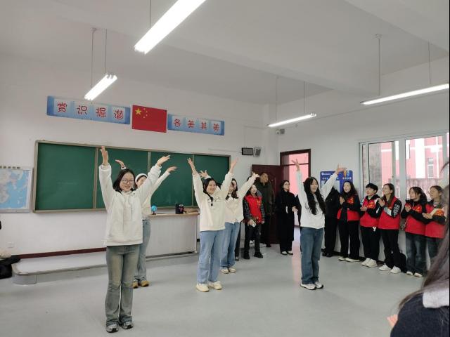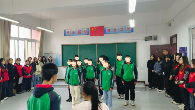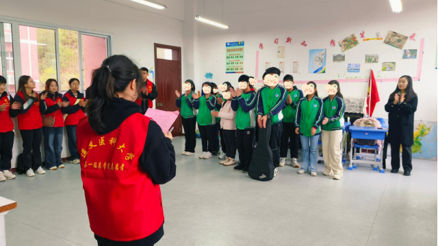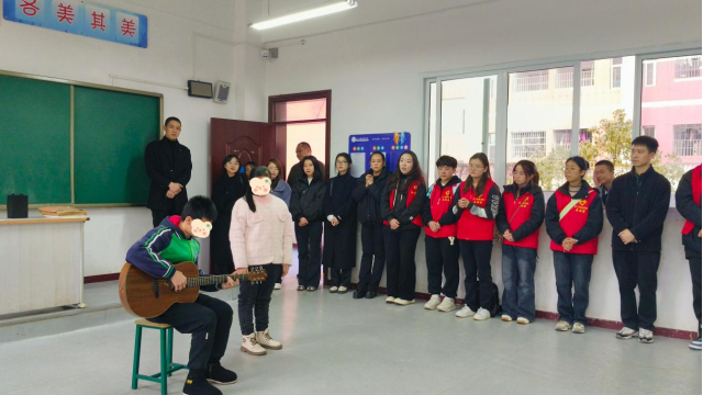 特殊教育公司的小朋友为志愿者们表演了精心准备的诗朗诵和吟诵。11名特殊教育公司的员工身着绿色校服声情并茂的朗诵,昂首挺胸的身姿、铿锵有力的声音,表达对世界的热爱与对未来的憧憬。而《长征七律》的吟诵,女孩纯净嗓音与男孩吉他旋律交织在一起,直击人心,让志愿者们在旋律中感受他们用音乐点亮的璀璨星空。随后2022级第二团总支的同学们给大家带来了《你笑起来真好看》歌唱表演,温暖的旋律和真挚的歌词,传递着积极向上的生活态度,让所有志愿者和孩子们情不自禁地一起合唱,将气氛推至高潮,纯真的笑声与欢快的音乐交织,整个教室被温暖的气息包裹。