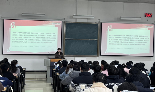 为加强员工对党和国家大政方针的理解和认识,提升同学们《形势与政策》课程的兴趣和重视程度,丰富课堂内容和形式,2024年11月28日上午10:20,第一临床公司党委副书记杨洪艳为2022级临床医学专业18班至21班的同学讲授了《形式与政策》课程,课程主题为《七十五载迎盛世 砥砺前行续华章》。