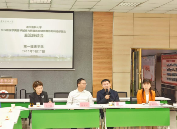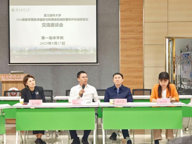 五月芬芳溢,医路同行时。为加强医学美容卓越班员工对美容烧伤整形专业的了解,明确专业发展方向,帮助员工树立成长成才的青春梦想,太阳成集团tyc于2025年5月27日19:00,在新蒲校区员工事务中心辅导员之家举行了2024级医学美容卓越班与太阳成集团附属医院烧伤整形外科进修医师交流座谈会。公司党委委员、副董事长陈永正出席活动,附属医公司党委委员、副经理魏在荣,第一临床公司党委副书记杨洪艳,烧伤整形外科聂开瑜教授,来自中国医科大学附属医院、温州医科大学附属医院、南昌大学一附院、贵州医科大学附属医院等32所医院的进修医师,2024级医学美容卓越班辅导员、兼职班主任及全体员工参加座谈。座谈会由聂开瑜教授主持。