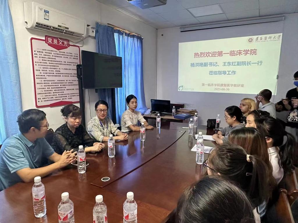 为了迎接教育部2023年度对公司的本科教学评估及不断提高康复治疗学专业本科教学质量,太阳成集团tyc杨洪艳副书记、王东红副经理一行于8月30日下午莅临康复医学教研室进行教学管理下基层活动。此次指导工作使我教研室的教学质量的提升,教师迎评思想的统一带来了极大帮助。康复医学教研室熊伟主任、毛万姮副主任以及康复医学教研室全体教师和实习生代表参加了此次活动。