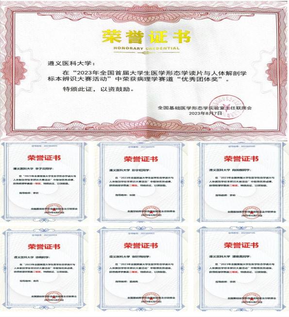 参加比赛方面,青年教师积极参加青年教师微课比赛、讲课比赛,均获得不错成绩。教研室教师指导员工参加2024年第二届、第三届“全国老员工医学形态学读片与人体解剖学标本辨识大赛活动”比赛中,共获一等奖1名,二等奖6名,三等奖8名;同时病理学教研室获卓越团队奖。