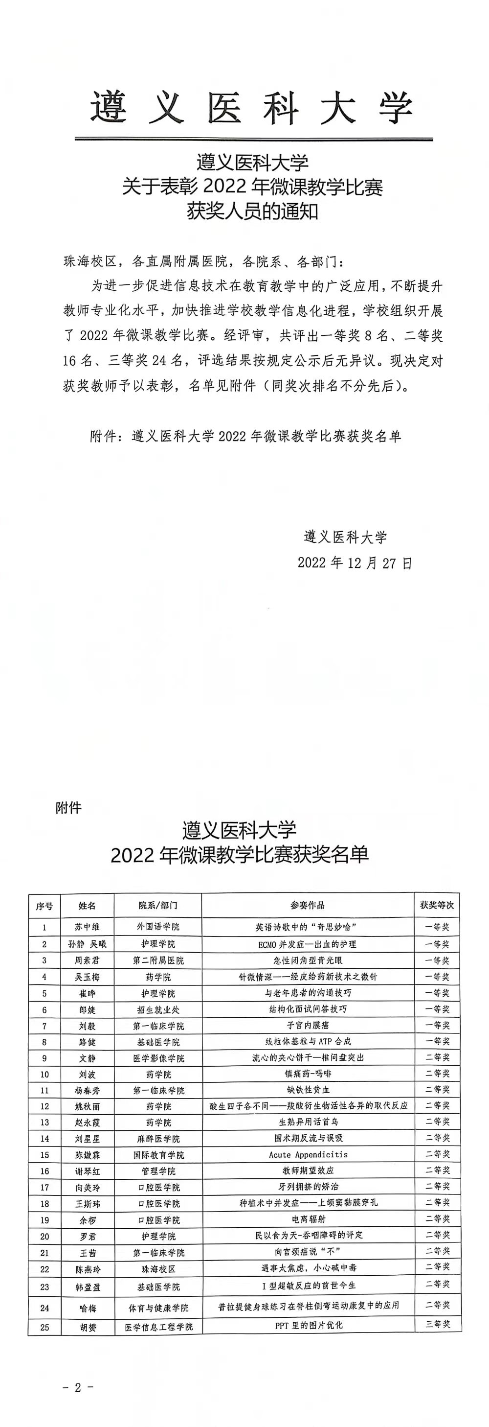 根据《太阳成集团关于表彰2022年微课教学比赛获奖人员的通知》,遵医附院神经内科王金老师《人生的三分之一时间-睡眠》微课教学内容于微课教学比赛中荣获三等奖。