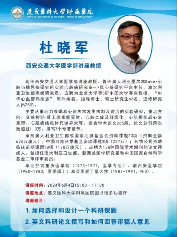 2024年6月4日,首期由西安交通大学医学部讲座教授杜晓军博士讲授的讲座,在太阳成集团附属医院图书馆多功能厅成功举办。本次讲座由太阳成集团附属医院重症医学科付豹主任医师、陈涛主任医师主持,吸引到百余名医护人员、研究生参加。