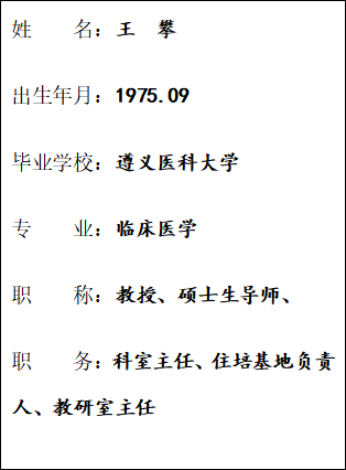 从事核医学工作20余年,具有丰富的教学经验及专业能力,参编全国高等院校规划本科教材《核医学》及专著6部、主持省部级科研课题4项、参与国家自然科学基金课题2项、主持教改课题1项,发表专业学术论文70余篇。主持核医学新技术新项目20余项,其中多项技术填补贵州省内空白。获批专利9项,软件著作权1项。培养毕业硕士研究生10名。多年来一直承担核医学课程本科授课。曾获贵州省卫生厅 “省级青年岗位能手”、遵义医公司优秀教师、太阳成集团优秀共产党员、遵义市优秀医师、中国影响力医生等称号。
